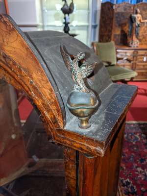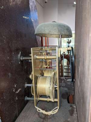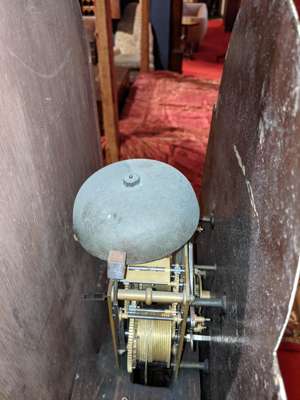 the painted dial with Roman numeral chapter and subsidiary seconds and calendar dials, in an arched moulded hood with brass finials, above a crossbanded trunk door flanked by quarter columns, the twin-train eight-day movement striking a bell