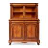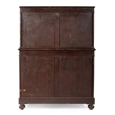 in two parts, the glazed upper section enclosing shelves, on a base with a frieze drawer and a pair of arched panel cupboard doors, flanked by fluted pilasters