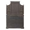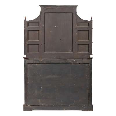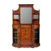 with a mirrored superstructure with open shelves on a base with a central cupboard flanked by quarter round glazed cabinets