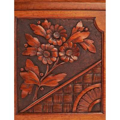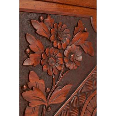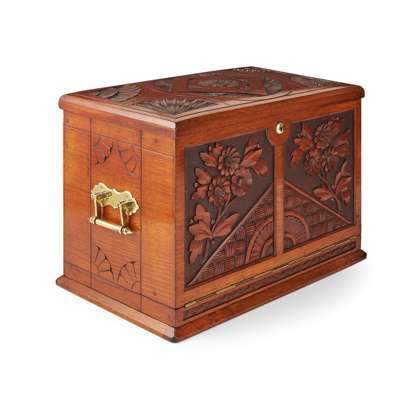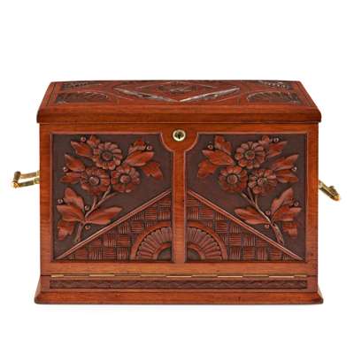 AESTHETIC PERIOD CARVED MAHOGANY AND BRASS MOUNTED STATIONERY CABINET, THORNHILL, LONDON