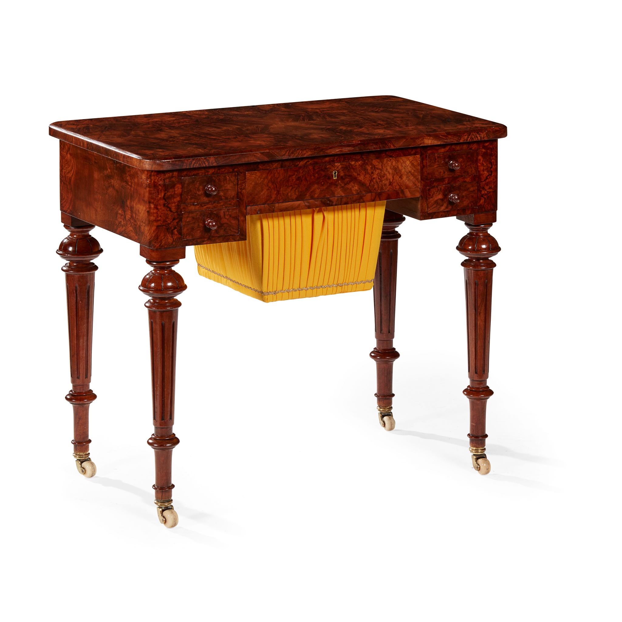 the quarter veneered top above an arrangement of drawers and sliding work box, on tapered legs with ceramic castors