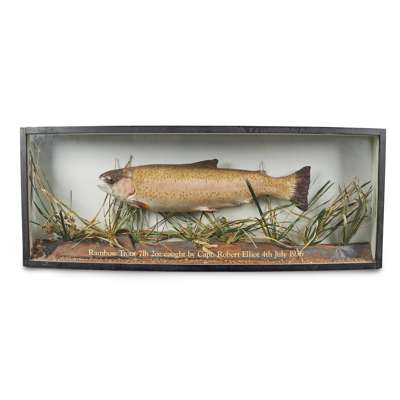 comprising a rainbow trout, with gilt label to front: 'Rainbow Trout 7lb 2 oz caught by Capt. Robert Elliot 4th July 1936', case 99cm wide; a pike and a trout, cases 79.5cm wide each
