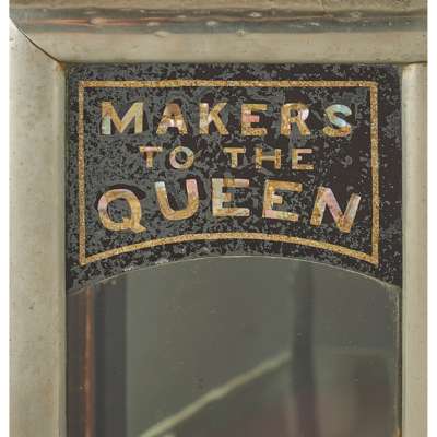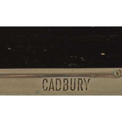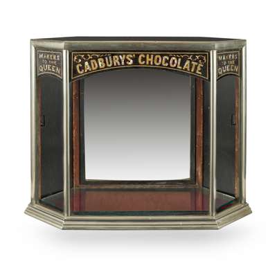 the glazed case with abalone-backed letters CADBURY'S CHOCOLATE and MAKERS TO THE QUEEN, the interior with a mirror back