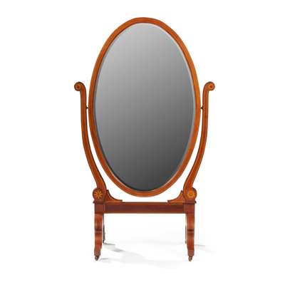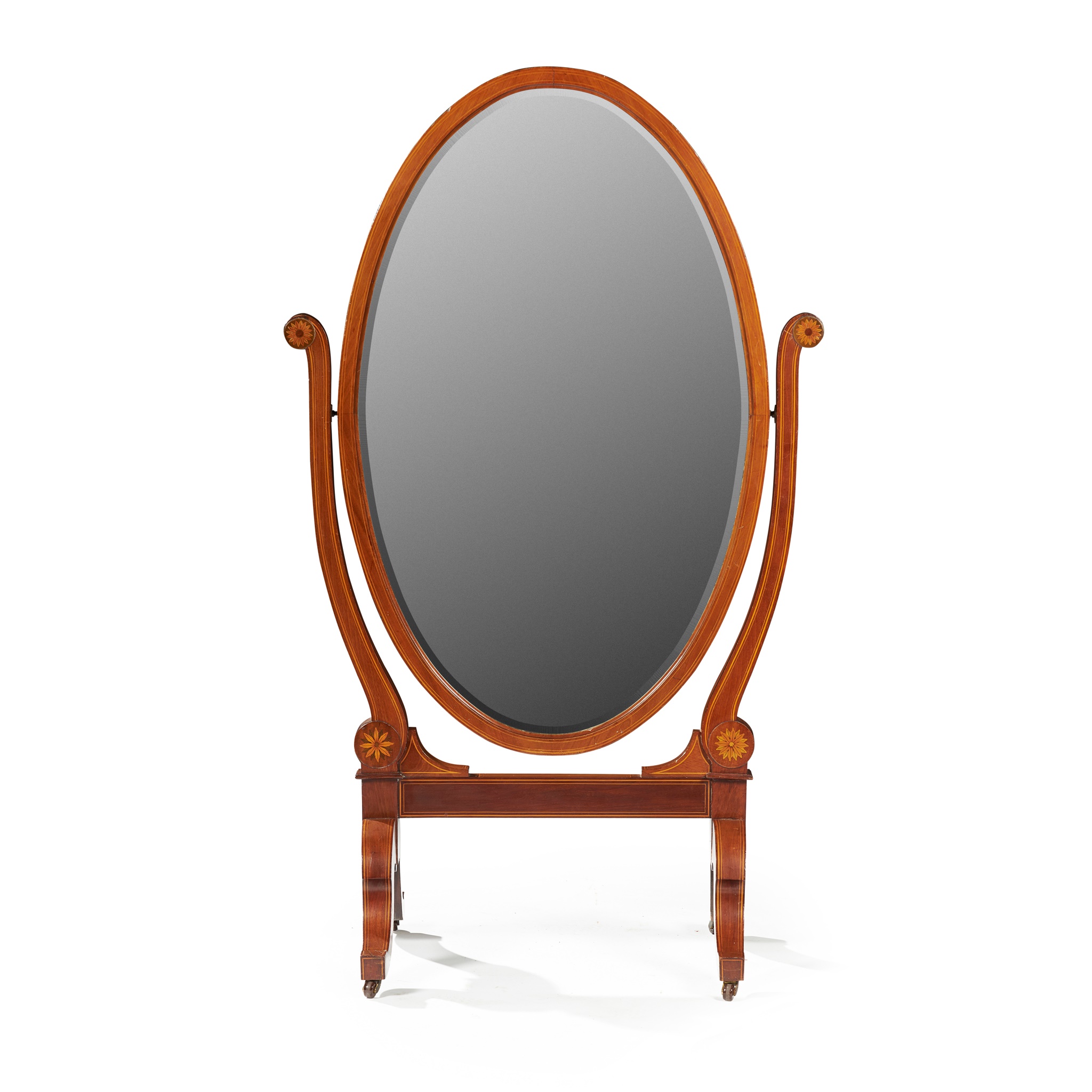 SHERATON REVIVAL MAHOGANY INLAID OVAL CHEVAL MIRROR