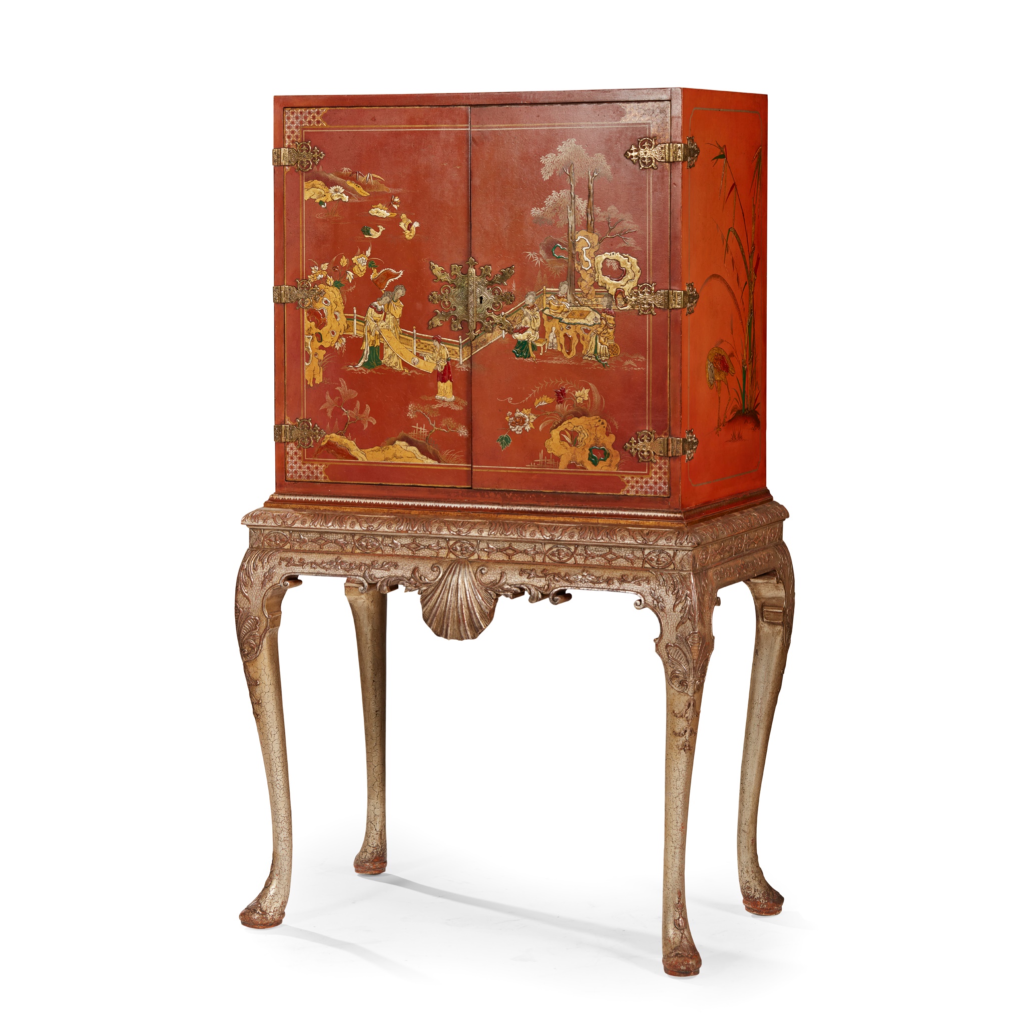 GEORGIAN STYLE RED JAPANNED CABINET-ON-STAND