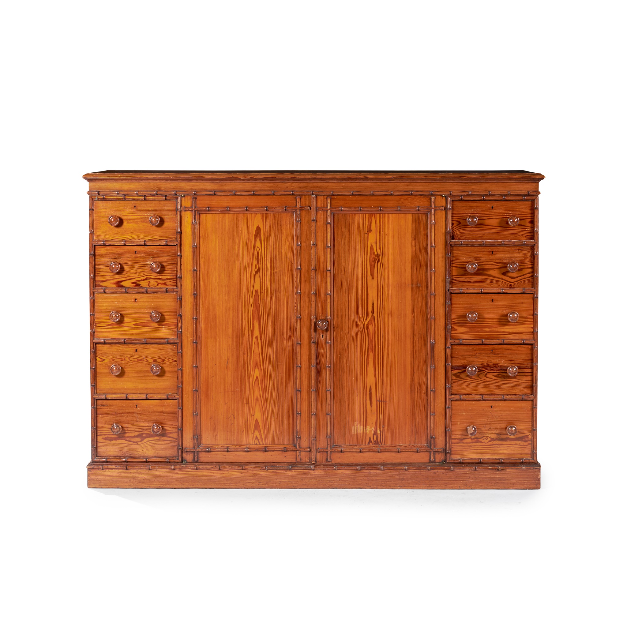 with banks of drawers flanking a pair of doors enclosing sliding trays, all outlined with simulated bamboo mouldings, the drawer stamped HOWARD & SONS BERNERS ST.