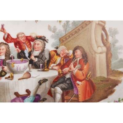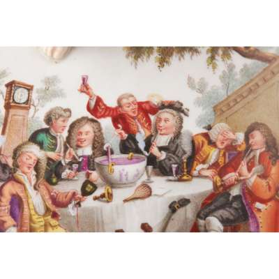 decorated with scenes after Hogarth, the cover with a Bacchic putto finial, blue sceptre mark