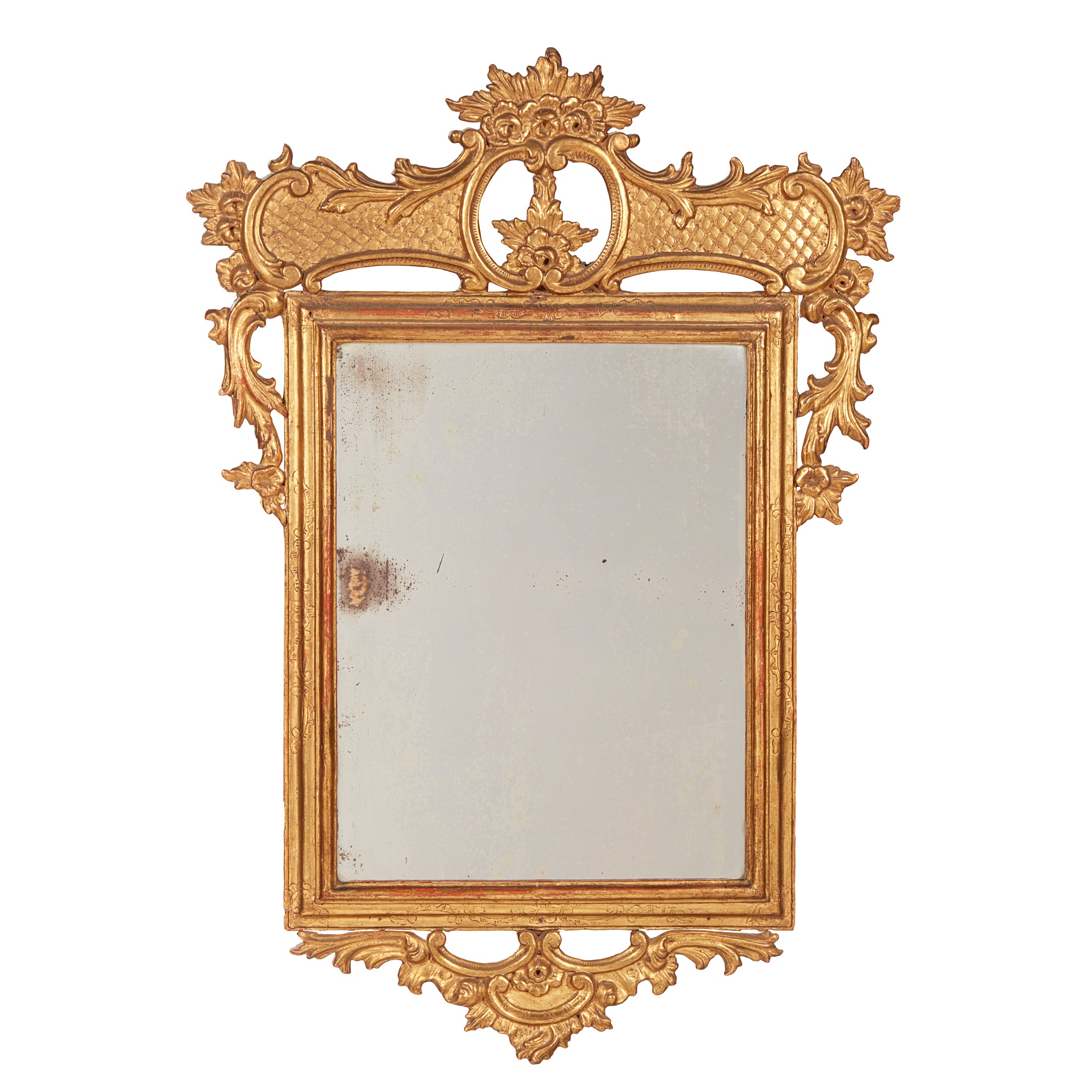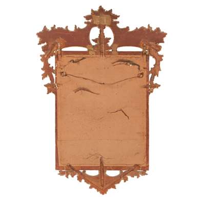 the rectangular mirror plate in a moulded frame with incised decoration, surmounted by a pierced cresting with C scrolls, acanthus, and flower heads