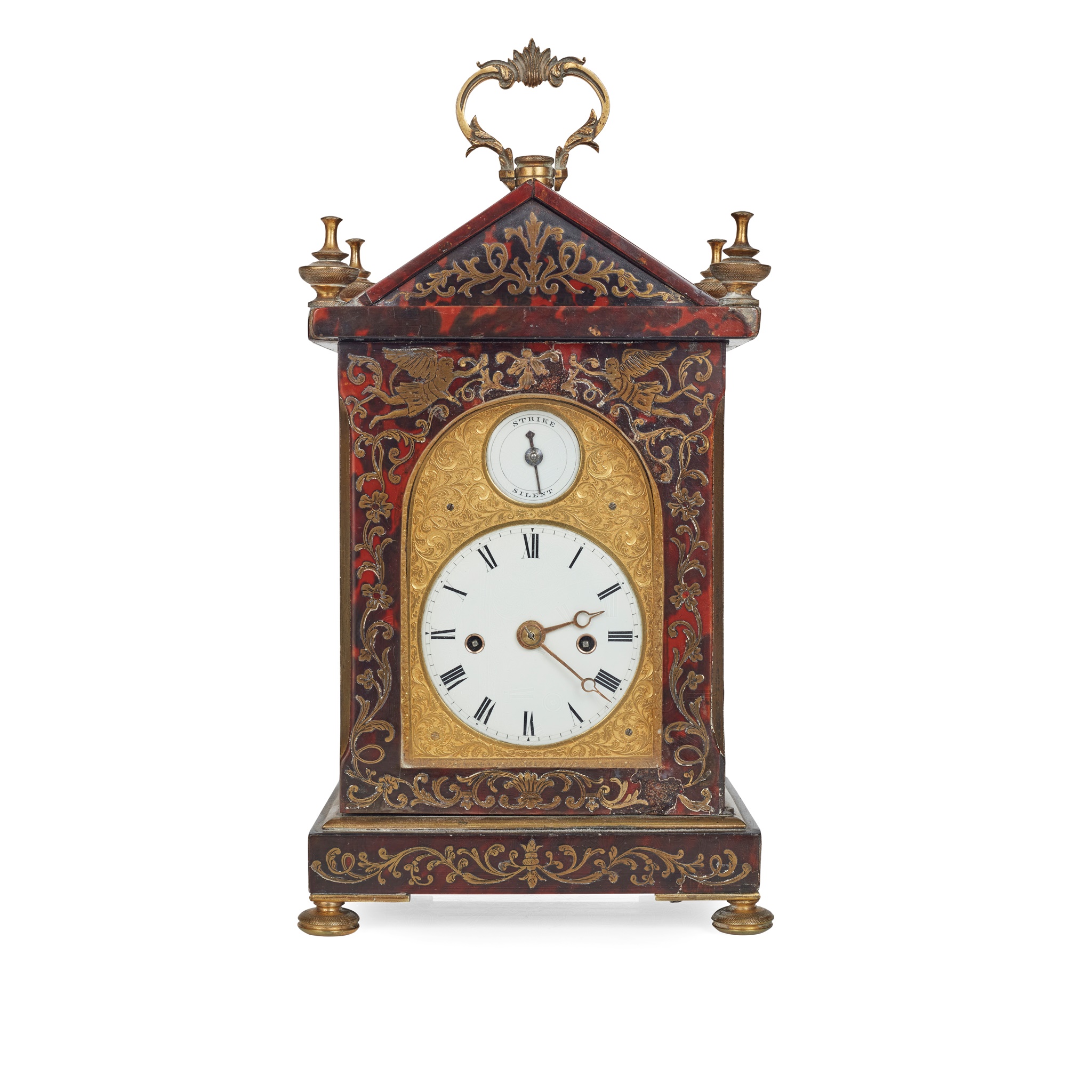the white enamel dial with Roman numerals, Strike/Silent dial, and two winding holes, in an engraved mask, the eight-day movement striking a bell