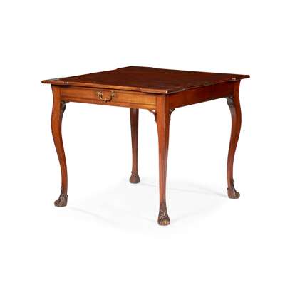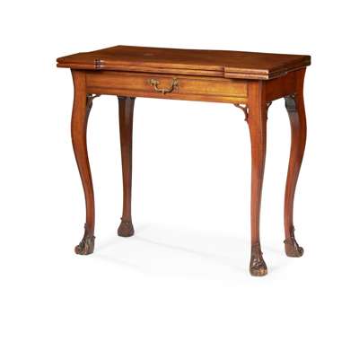 the fold-over top with outset square corners, above a frieze drawer, raised on cabriole legs with scroll carved feet