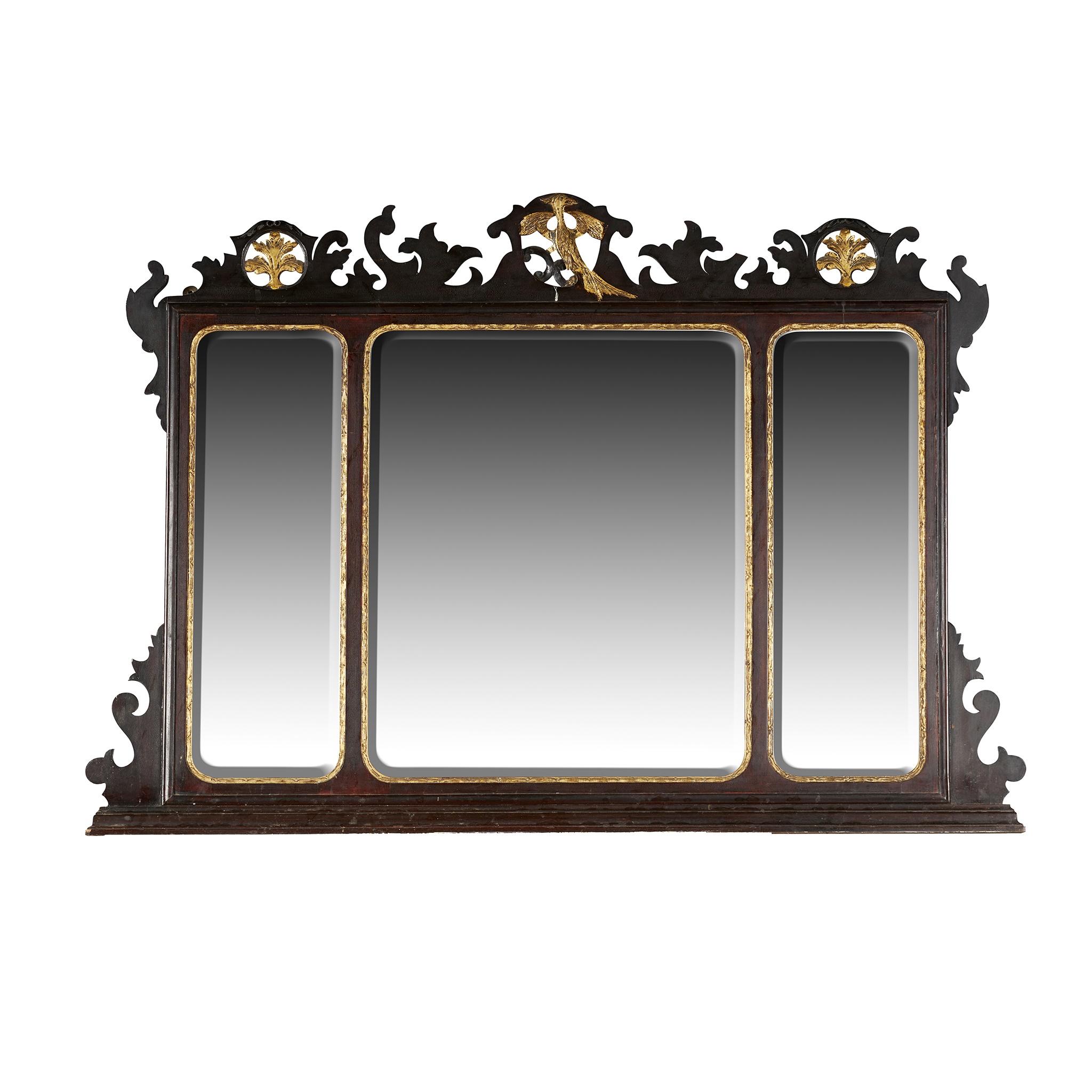 GEORGIAN STYLE STAINED MAHOGANY AND PARCEL GILT TRIPTYCH OVERMANTEL MIRROR