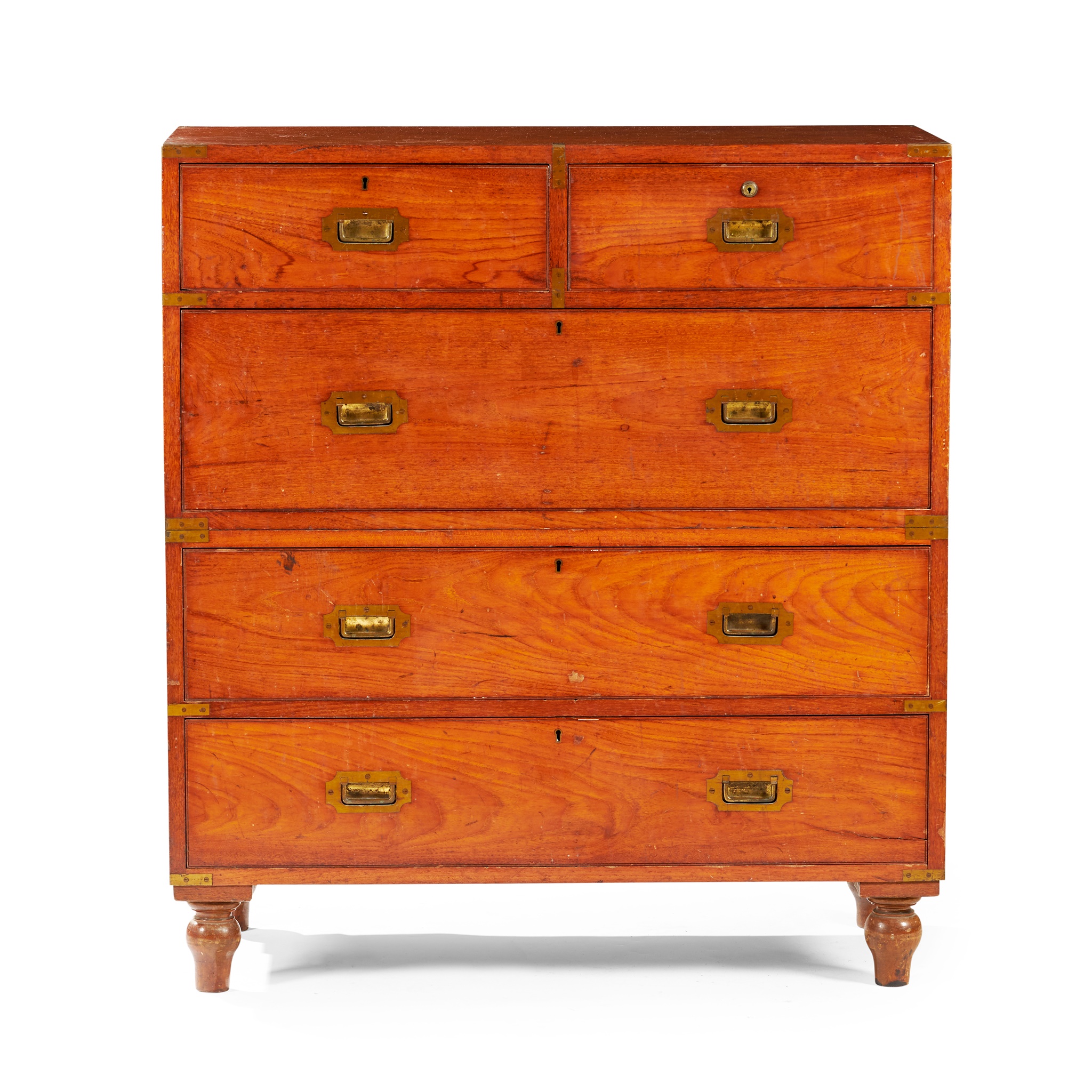 in two parts; the top section with two short drawers over a long drawer, the lower section with two further long drawers