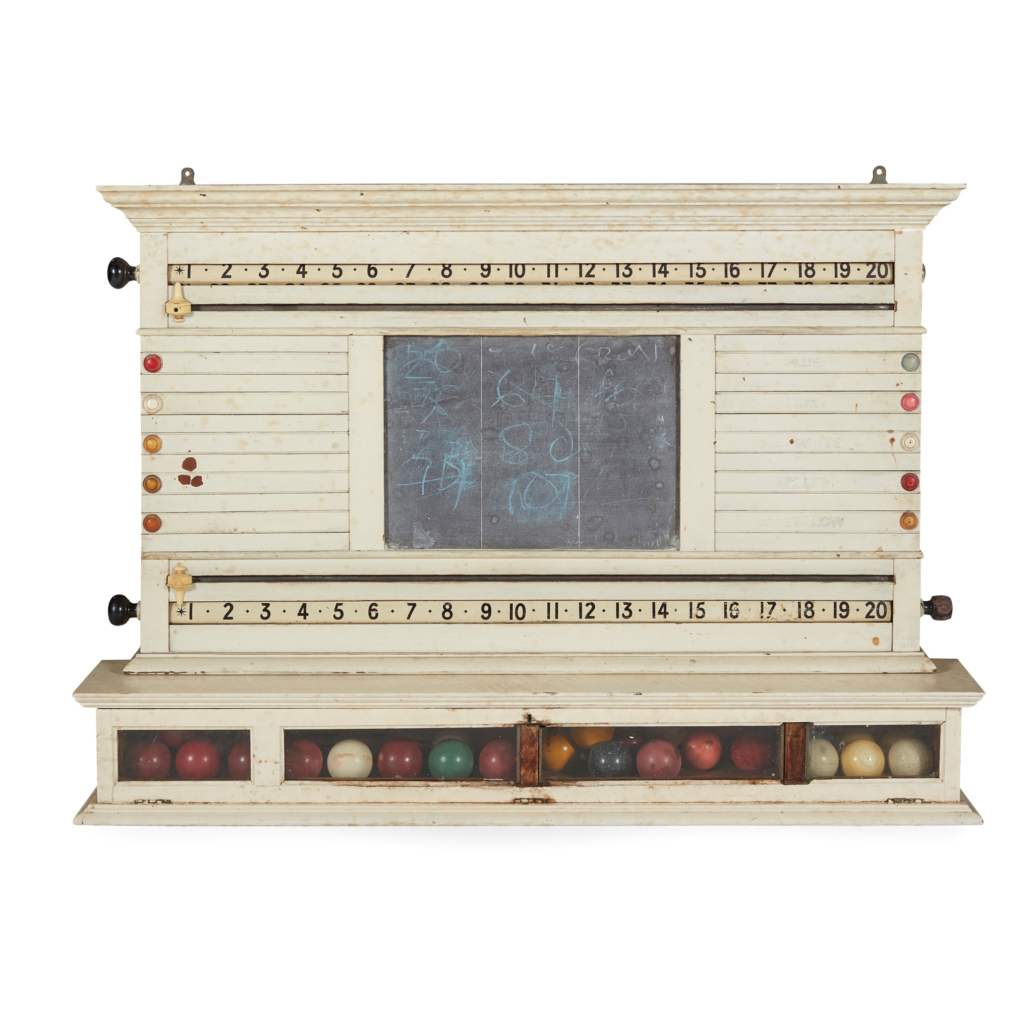 the scoreboard with an inset slate panel; with a collection of ivory snooker balls in various colours, three unstained cue balls; in a painted wall mounted case; both later painted white