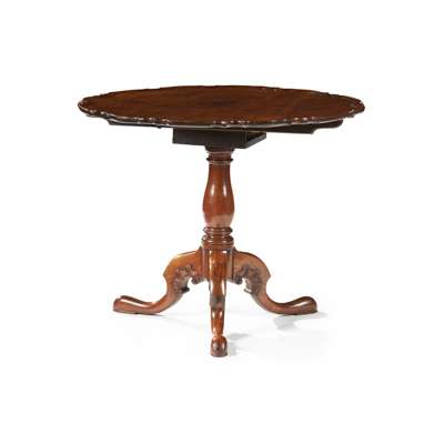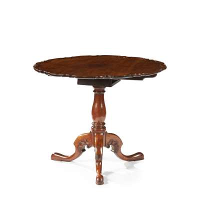 the single board tilt top on a baluster column and hipped cabriole legs with auricular carving