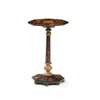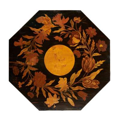 the circular top with flower marquetry on a hexagonal column and base with further marquetry