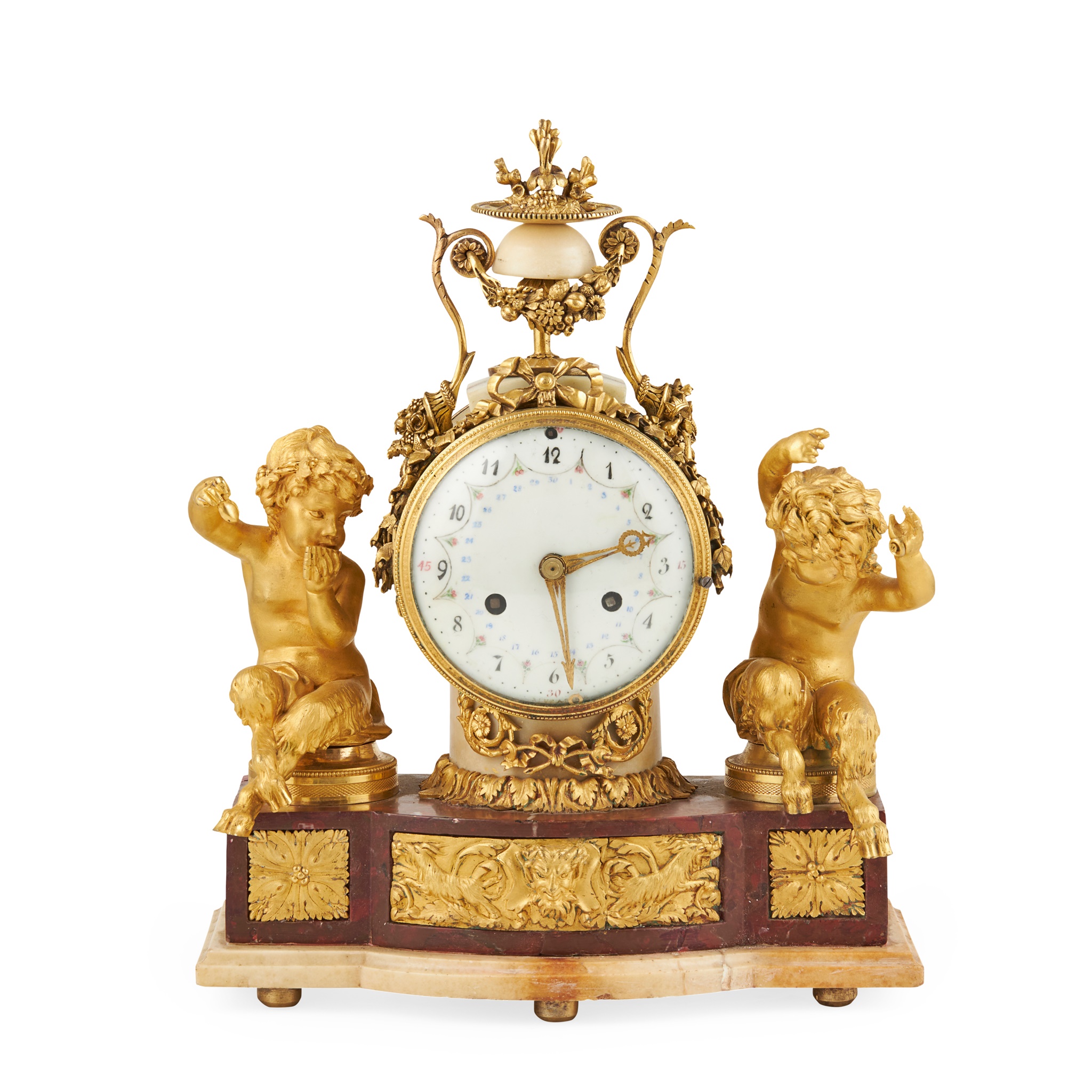 FRENCH GILT BRONZE AND ROUGE MARBLE FIGURAL MANTEL CLOCK