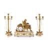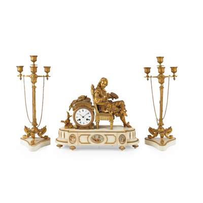 FRENCH GILT METAL AND MARBLE ASSEMBLED THREE-PIECE FIGURAL CLOCK GARNITURE