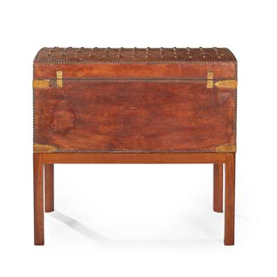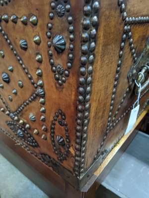 covered in brown hide with all-over studded decoration, on a later hardwood stand