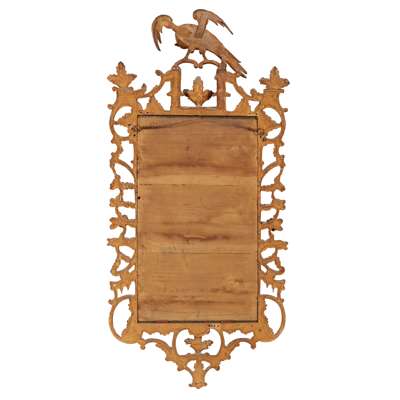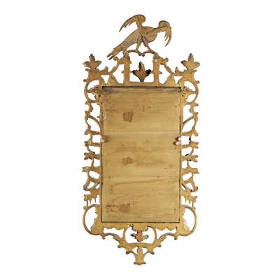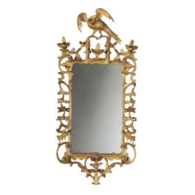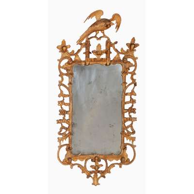 the rectangular mirror plates in rococo style frames carved with rocaille, C scrolls, fruit and flower trails, and surmounted by ho-ho birds
