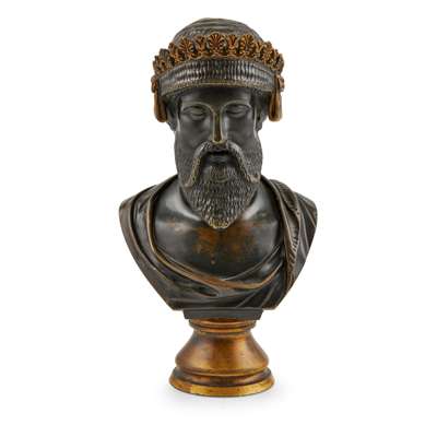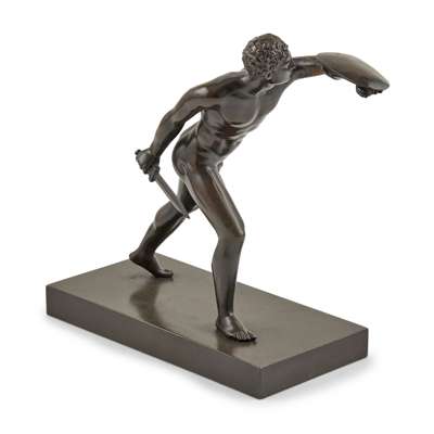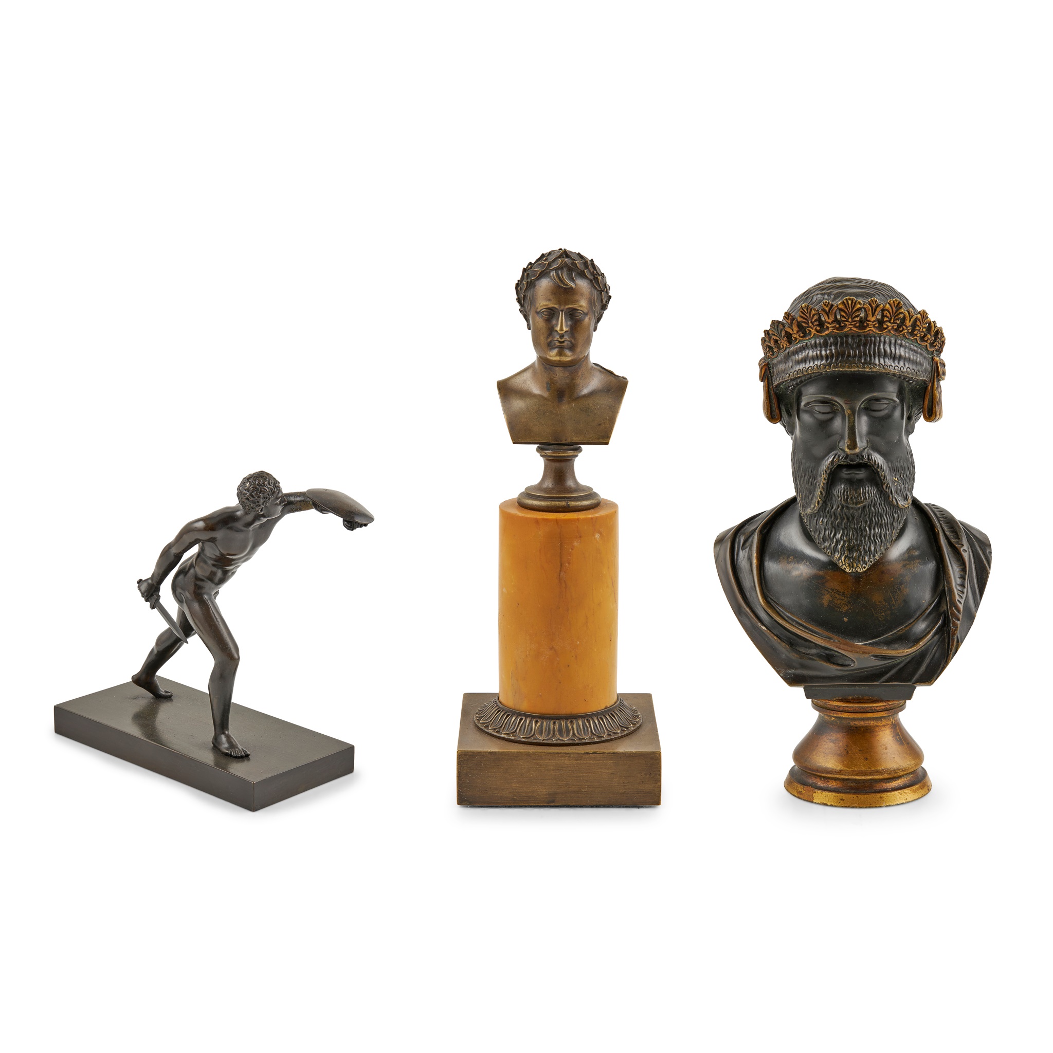 to include a BRONZE FIGURE OF THE BORGHESE GLADIATOR, after the antique; a FRENCH BRONZE BUST OF ZEUS, marked G S with another indistinct mark to the reverse, 21.5cm high; and a BRONZE BUST OF NAPOLEON, the base inscribed 'TIL MOGENS 8-4-1934 FRA TANTE FRIDA, ONKEL LAURITS', 20.5cm high