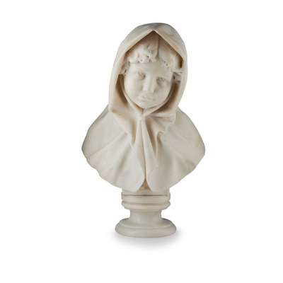 WHITE MARBLE BUST OF A CLOAKED GIRL