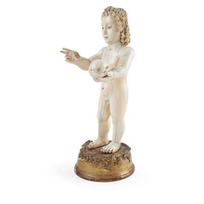 LARGE INDO-PORTUGUESE CARVED IVORY FIGURE OF THE INFANT CHRIST AS SALVATOR MUNDI, THE SAVIOUR OF THE WORLD Y