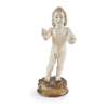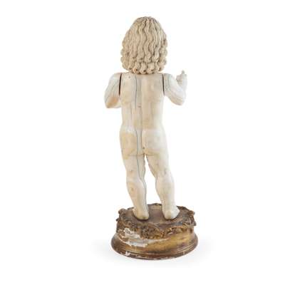 the child Christ standing with both arms extending, one holding an orb to represent the world in his left hand, his right hand raised in blessing, on a giltwood and gesso base