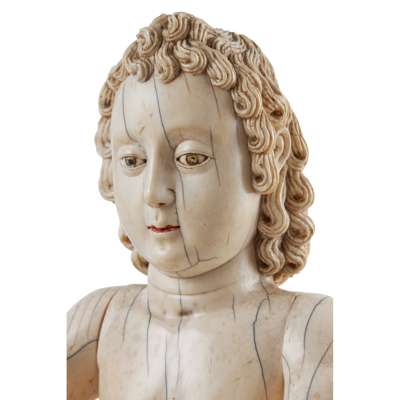Despite its vigorous modeling, the figurewas probably meant to be dressed in a luxurious garment, which would have been supplied by the faithful owner in acts of devotion. While the iconography is clearly of European origin, the style is undoubtedly Goan. The hair is carved in tight, regular coils, and the face with its round cheeks, big eyes and small mouth with remnants of polychromatic paint point to its Indian roots.
