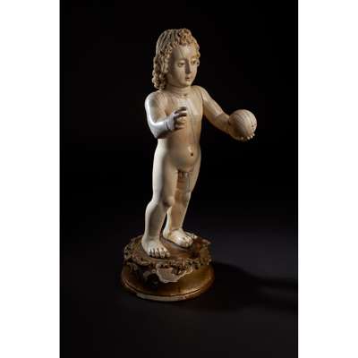 Note: Goa came under Portuguese rule in 1510,and subsequently became an eastern trading capital of the Portuguese empire and the seat of Christian imperialism, whose influence stretched from the Cape of Good Hope to the Sea of Japan. The Portuguese found a well-established infrastructure for ivory carving, with experienced artists and workshops. This explains the resulting hybrid of sculptures drawing from European iconography and traditional Indian stylistic conventions. Christ is depicted here in a variation of the Salvator Mundi image tradition: instead of the adult Christ he is depicted as a child, with the right hand raised in the typical gesture of benediction and left holding an orb, known as globus cruciger. This depiction of the infant Christ started appearing in the early 16th century, notably in the Infant Christ of Mechelen, and has gained popularity in Spain as the ‘Niño de la bola’ or child with a ball. Famous depictions go backto the artists Juan Martínez Montañés and Jerónimo Hernández de Estrada.