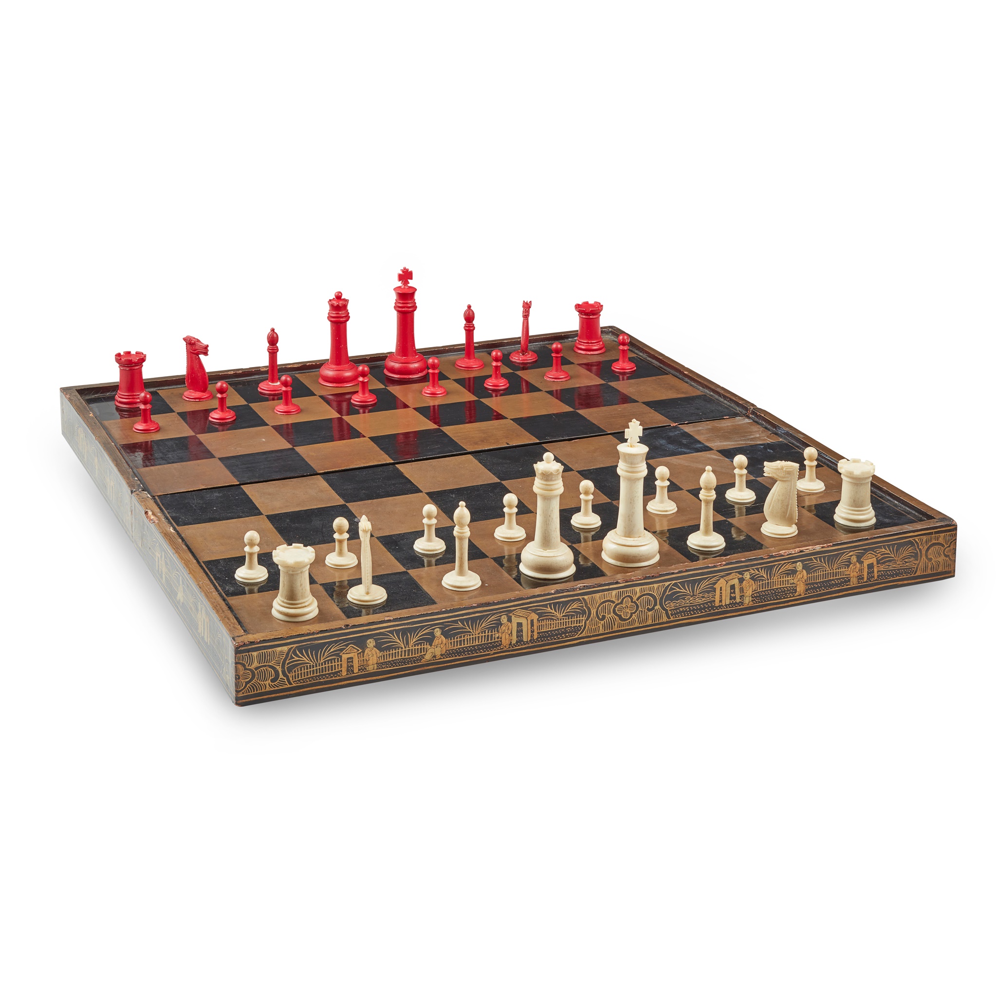 the hinged folding board with thirty-two carved bone chess pieces, one side stained red