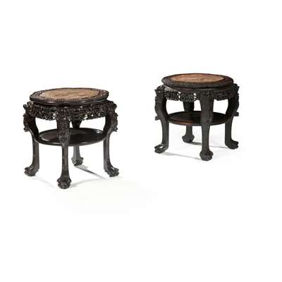 MATCHED PAIR OF CHINESE HONGMU MARBLE TOPPED VASE STANDS