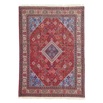 the red field with indigo medallion, blue spandrels, within ivory stylised palmette and vine border