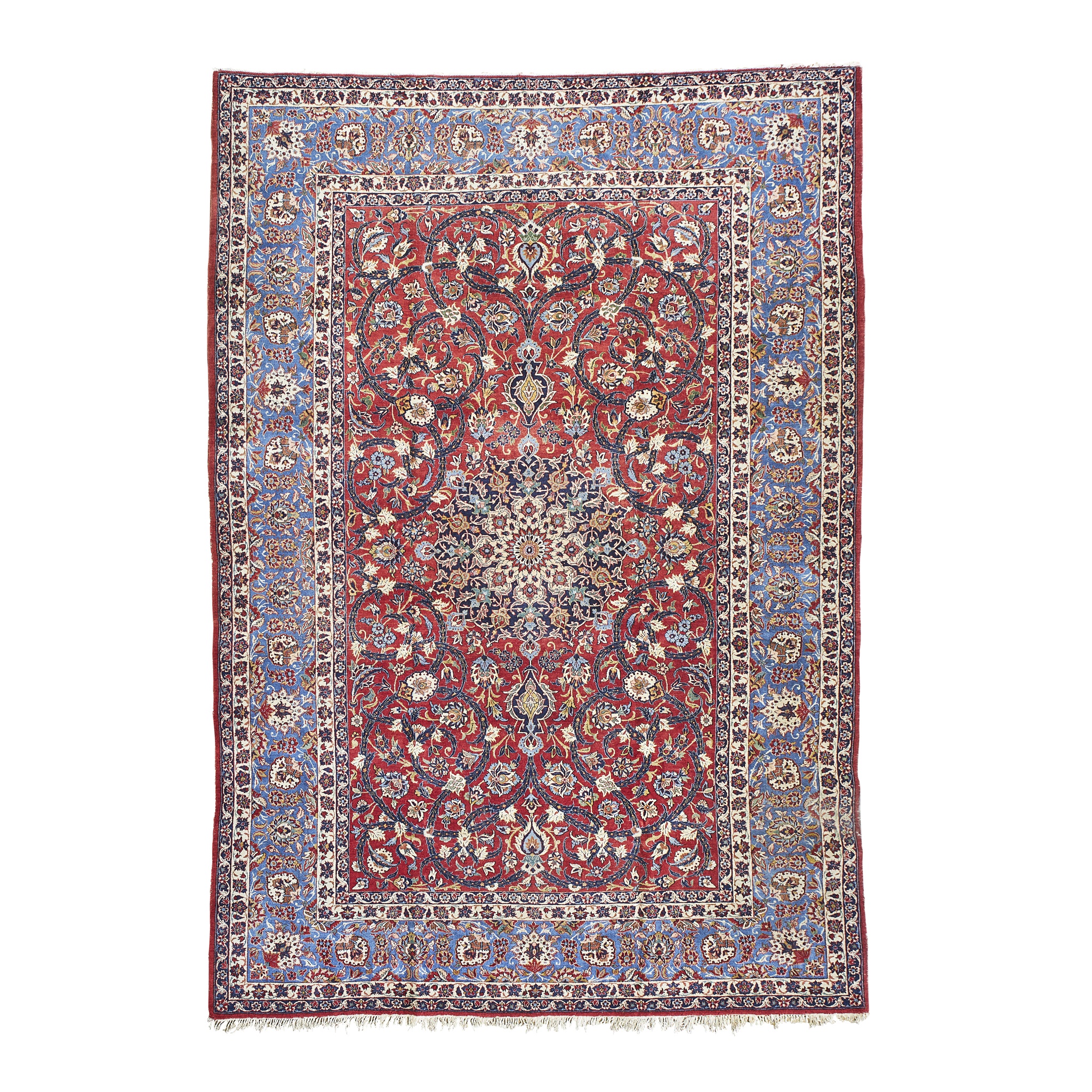 the red field with indigo and cream medallion, within blue palmette and vine border