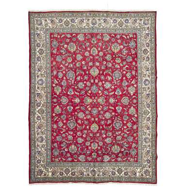 the red field with allover palmette and vine pattern, within ivory palmette and vine border, signed to one end