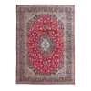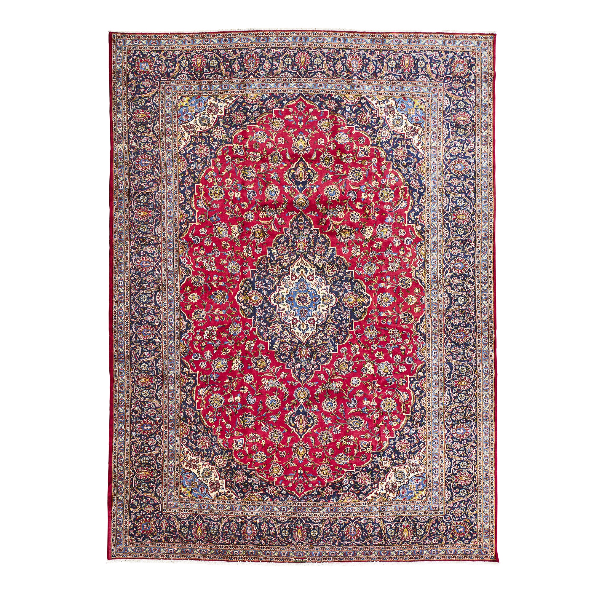 the red field with indigo and ivory medallion, similar spandrels, within indigo palmette and arabesque vine border
