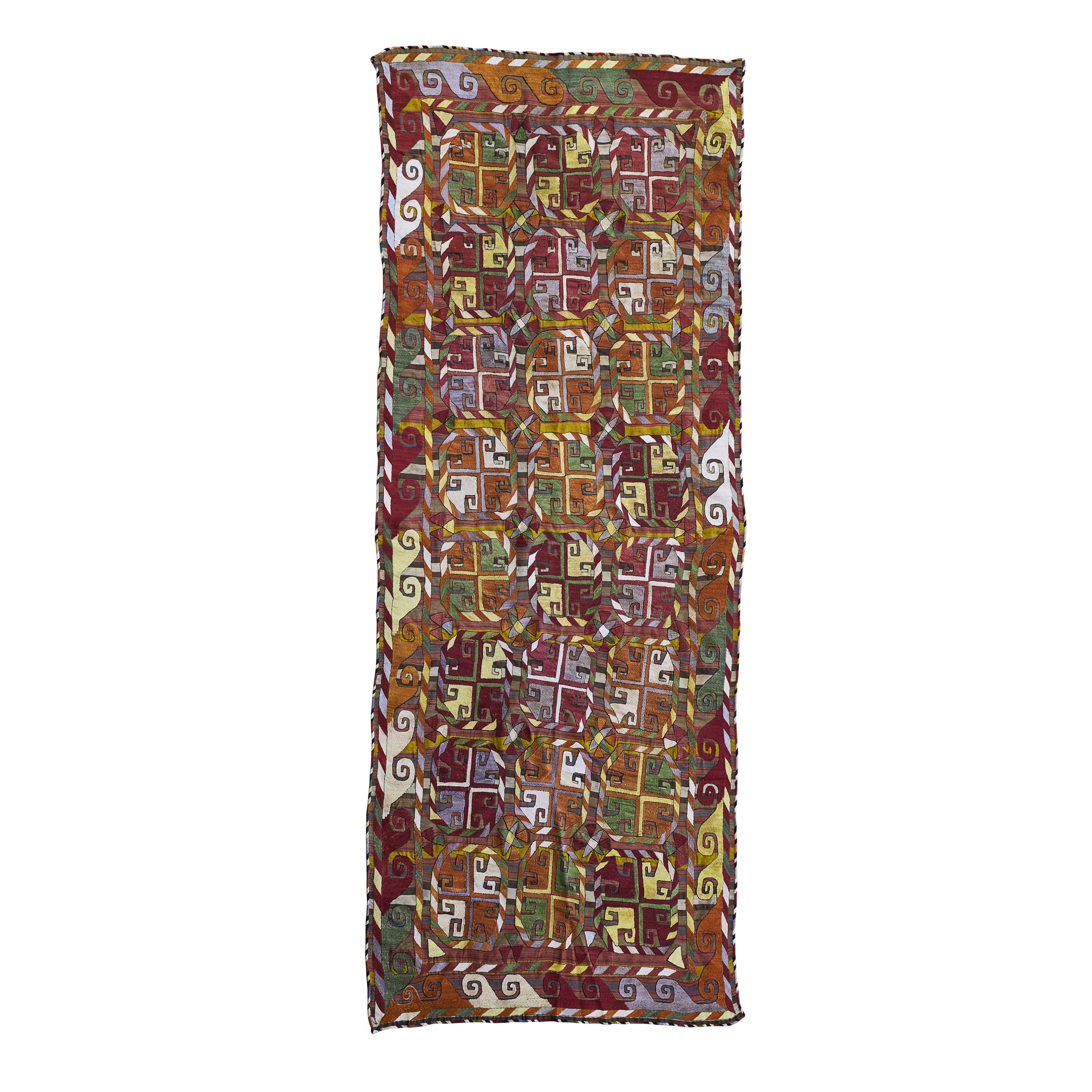 the polychrome field with three columns of eight guls, within running dog border