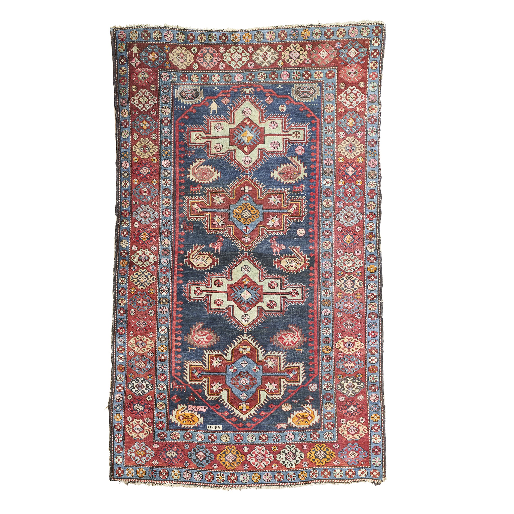 the indigo field with four red and green medallions, within red rosette border