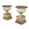 PAIR OF COMPOSITION STONE URNS AND PEDESTALS