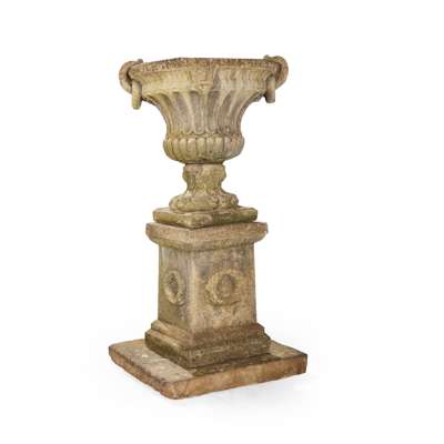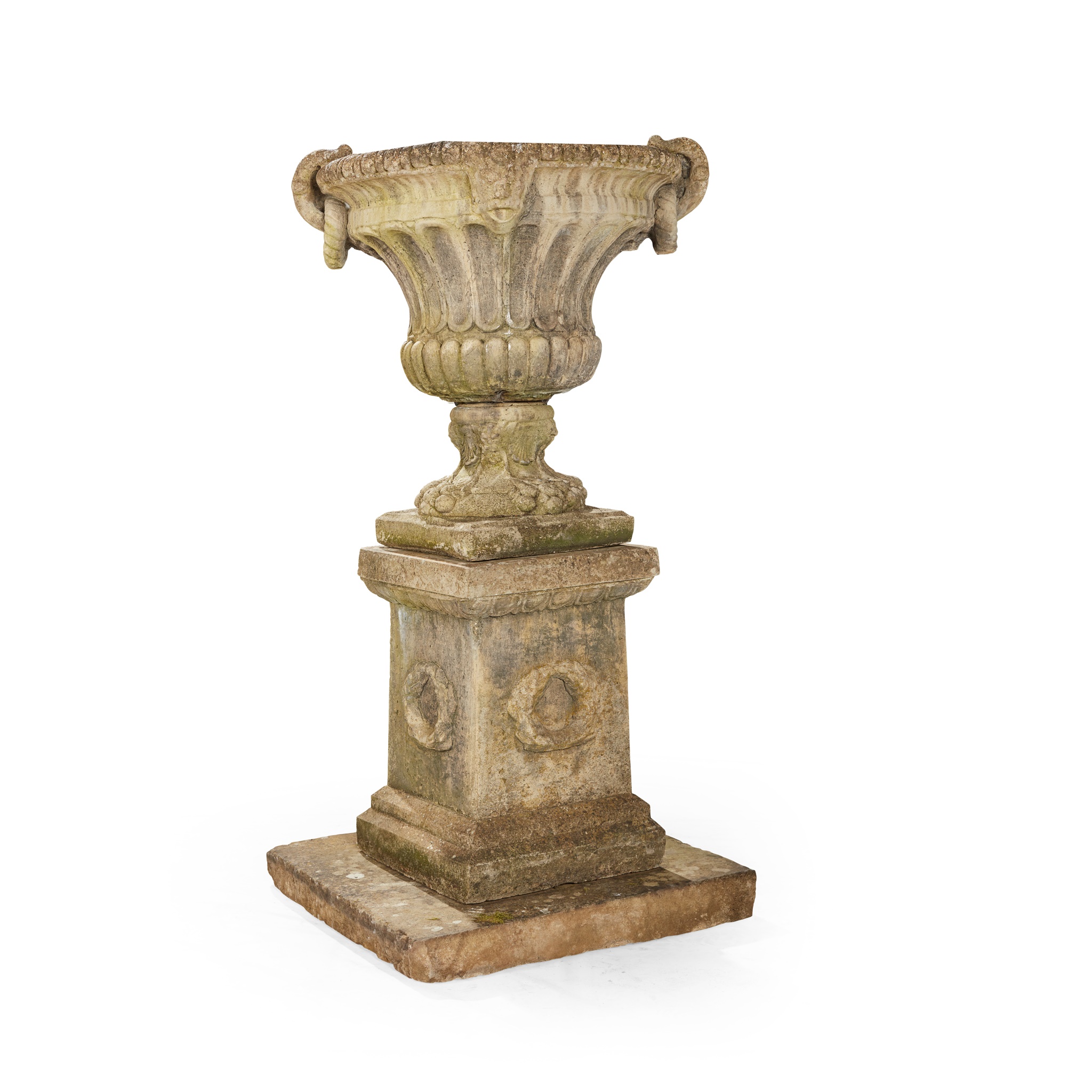 LARGE COMPOSITION STONE URN AND PEDESTAL