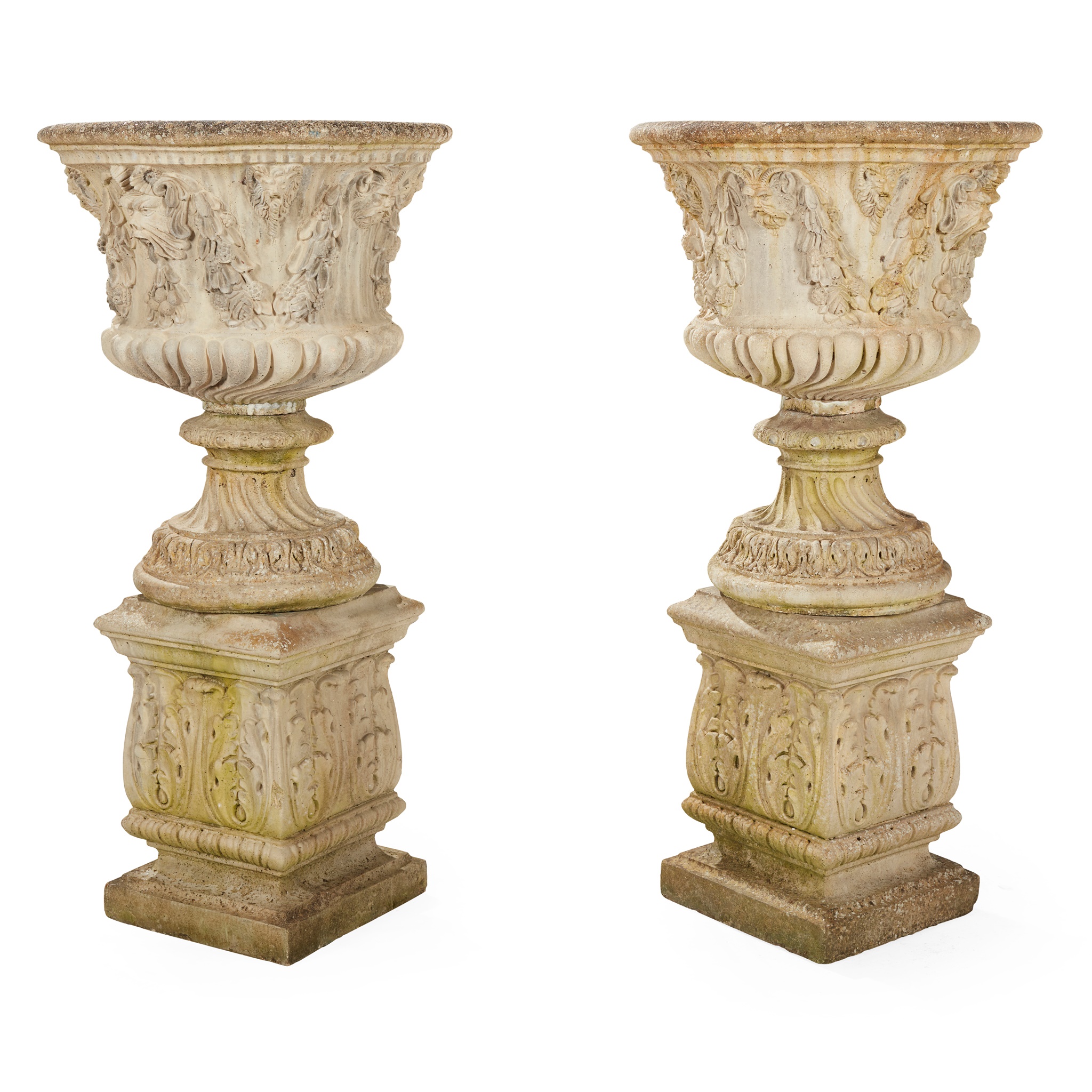 cast with masks and garlands, on square acanthus cast pedestals