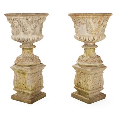 PAIR OF COMPOSITION STONE URNS AND PEDESTALS