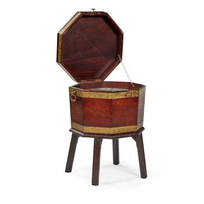 GEORGE III BRASS BANDED MAHOGANY OCTAGONAL WINE COOLER