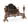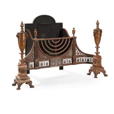 with a pierced palmette frieze flanked by flaming urn finials, the fireback cast with an urn