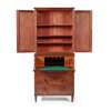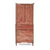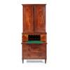 the upper part with a pair of moulded panel doors enclosing adjustable shelves; the base with a secretaire drawer and three graduated long drawers, raised on turned feet