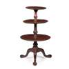 with three graduated dished tiers with gadrooned edges raised and divided by spiral carved baluster columns, on a shell carved tripod base with claw and ball feet with brass castors