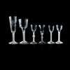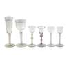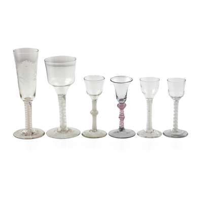 comprising a large funnel-bowled glass engraved with flowers, on a double-twist stem, 22.5cm high; a goblet, on a double-twist stem, 20cm high; a knopped-stem glass, 15.5cm high; two with rib-moulded bowls and double-twist stems, 15cm and 14.5cm high; and a DUTCH RED ENAMEL TWIST WINE GLASS, 15cm high