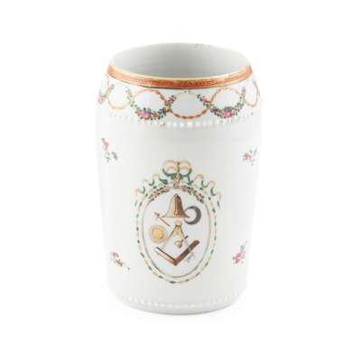 of barrel form with beaded bands and entwined bifurcated strap handles; enamelled with Masonic symbols and flower sprays and garlands