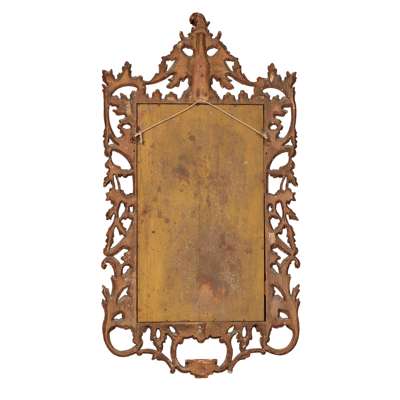 the shaped rectangular mirror plate in pierced rococo frame carved with C and foliate scrolls with trailing flower garlands