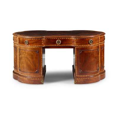 LATE GEORGE III MAHOGANY, TULIPWOOD, AND SATINWOOD PEDESTAL DESK