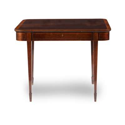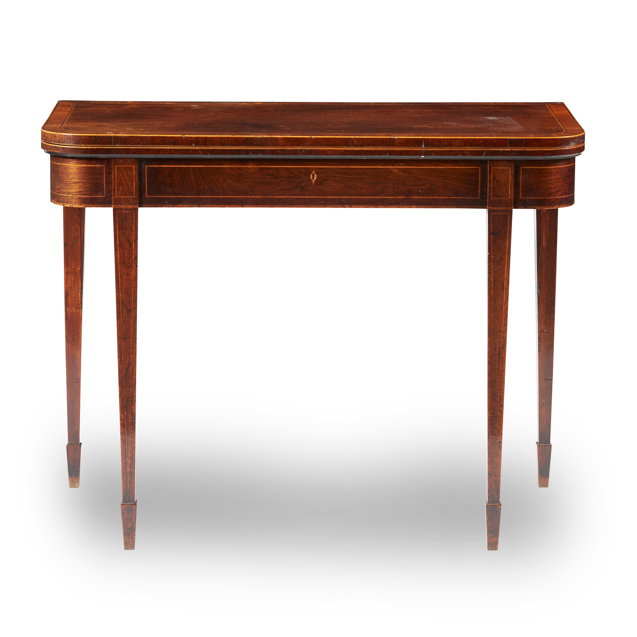 LATE GEORGE III ROSEWOOD AND SATINWOOD FOLD-OVER TEA TABLE Y